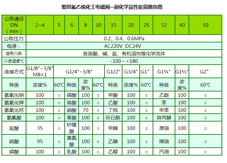聚四氟乙烯化工電磁閥具有優(yōu)異的耐腐蝕性能,對所有的常用化學品都呈惰性。幾乎可以抵抗所有化學介質(zhì)(包括濃硫酸和王水)。具有優(yōu)異的耐熱性能,應用溫度為-100~180℃,材料可長期在230~260℃下工作。特別適合腐蝕嚴重、溫度高且化學品不允許與潤滑劑接觸的環(huán)境。