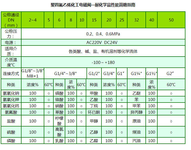 聚四氟乙烯化工電磁閥具有優(yōu)異的耐腐蝕性能,對所有的常用化學(xué)品都呈惰性。幾乎可以抵抗所有化學(xué)介質(zhì)(包括濃硫酸和王水)。具有優(yōu)異的耐熱性能,應(yīng)用溫度為-100~180℃,材料可長期在230~260℃下工作。特別適合腐蝕嚴(yán)重、溫度高且化學(xué)品不允許與潤滑劑接觸的環(huán)境。