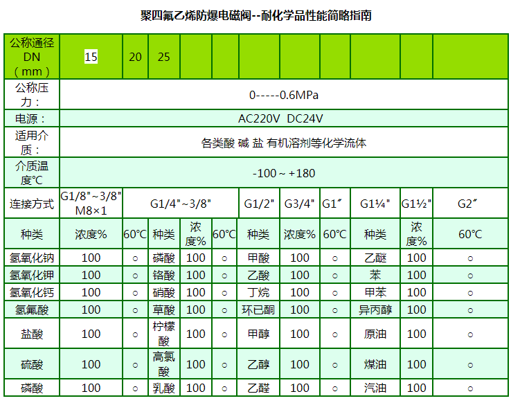 “禹成牌”化工電磁閥由于啟閉原理的獨(dú)特性和結(jié)構(gòu)設(shè)計的科學(xué)性,產(chǎn)品的所有部件均可根據(jù)不同的化學(xué)介質(zhì)選用不同的高分子材料制造,同時由于它的先導(dǎo)孔和卸壓孔是傳統(tǒng)閥的幾十倍大,復(fù)位彈簧設(shè)置在介質(zhì)外,因此它具有不易堵塞、耐酸堿、抗腐蝕和使用壽命長等優(yōu)點(diǎn),可適應(yīng)于各種化學(xué)流體介質(zhì),是化工流體自動化生產(chǎn)設(shè)備的最佳配套產(chǎn)品。