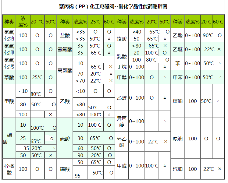 聚丙烯(PP)化工電磁閥具有優(yōu)良的耐腐蝕性能,在80℃下能耐除氧化性外的一般無機酸、堿、鹽、氣體、水等的腐蝕。它對極性有機溶劑和強極性的羧酸、醇類有較大的抗溶劑能力。少數(shù)氧化性酸在濃度較高時對其有較大的腐蝕作用。有一定的剛度和強度,適用溫度為-0~120℃。