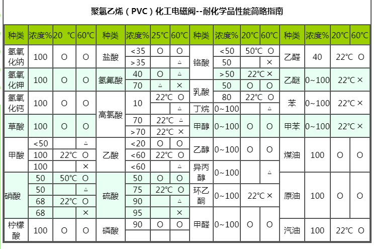 聚氯乙烯(PVC)化工電磁閥具有優(yōu)良的耐腐蝕性能,耐酸(包括稀硝酸)、堿、鹽、氣體、水等的腐蝕。對(duì)無極性的烷烴及強(qiáng)極性的羧酸、醇類有較大的抗溶劑能力。少數(shù)氧化性酸在濃度較高時(shí)對(duì)其有較大的腐蝕作用。有一定的剛度和強(qiáng)度,適用溫度為-0~60℃。