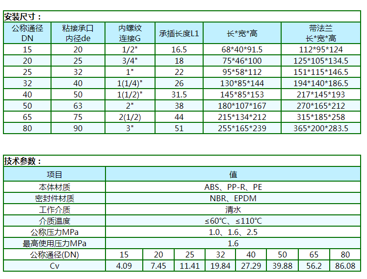 本產品民用系列選用國際通用型食品級工程塑料(ABS、PP-R、PE等)注造。工業(yè)用系列選用進口阻燃型高強度工程塑料(PC等)注造。產品具有重量輕、耐腐蝕、不生銹、不結垢、導冷不結霜、導熱系數低,絕緣性能好,環(huán)保衛(wèi)生等優(yōu)點。啟閉原理上:采用浮動閥芯,利用流體壓力差,誘導式啟閉的專利技術成果。因啟閉時無磨損(屬接觸型啟閉),而解決了傳統(tǒng)閥門因強制性啟閉而造成的啟閉部件和密封件磨損所引起的“跑、冒、滴、漏”的歷史性難題。它具有安裝使用方便,節(jié)能節(jié)水效果顯著(可節(jié)約傳統(tǒng)閥門的外泄內漏所浪費掉的水),使用壽命長及物美價廉等特點。